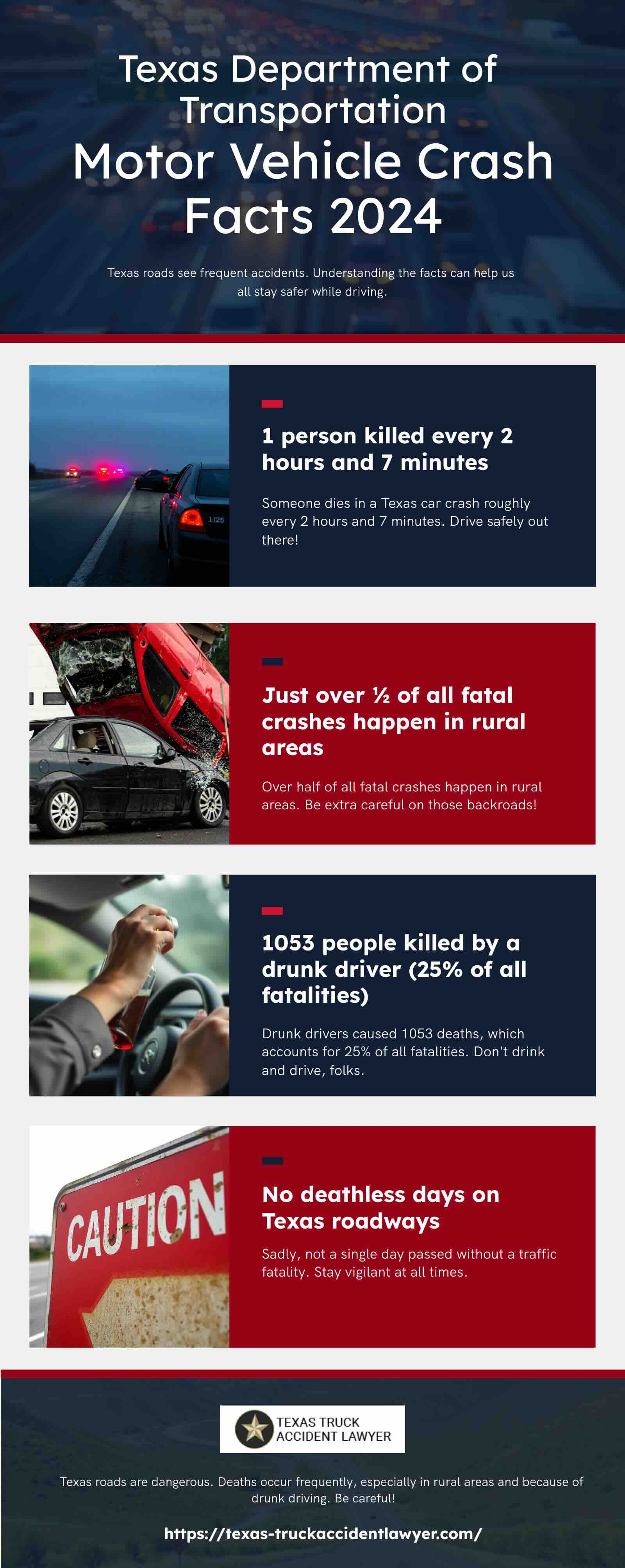 The Texas Department of Transportation (TxDOT) collects data from crashes across the state and compiles the information into reports. In 2024, 39,393 total crashes involved commercial vehicles in Texas. Six hundred eight people died because of a commercial vehicle crash, and thousands suffered injuries. One thousand six hundred and one people reported serious injuries as a result of a collision with a commercial vehicle. Texas is one of the states with the most truck crash fatalities.